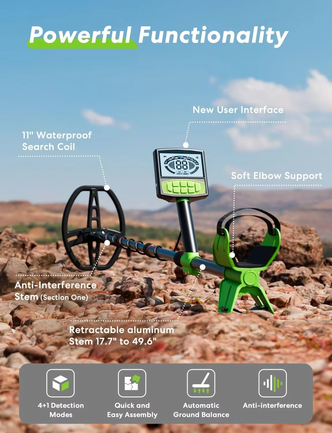Mechanical: S-rod with electronics housing on rod, 3-piece breakdown construction, nonmetallic telescoping lower rod, adjustable position armrest. This metal detector is very popular in the world market with very stable performance and high quality.