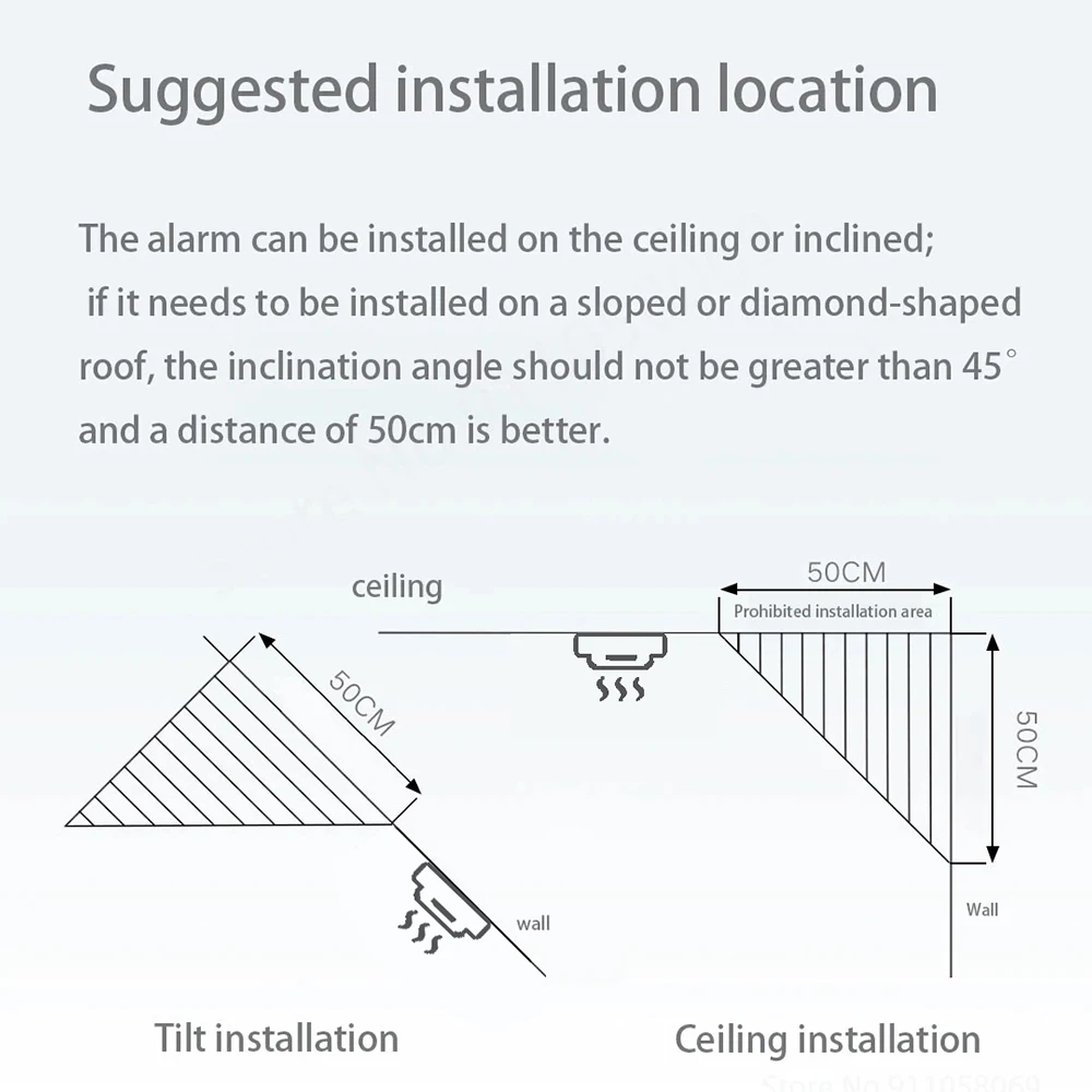 The alarm can be installed on the ceiling or inclined; if it needs to be installed on a sloping roof or a diamond-shaped roof, the inclination angle should not be greater than 45°, and the distance is 50cm.